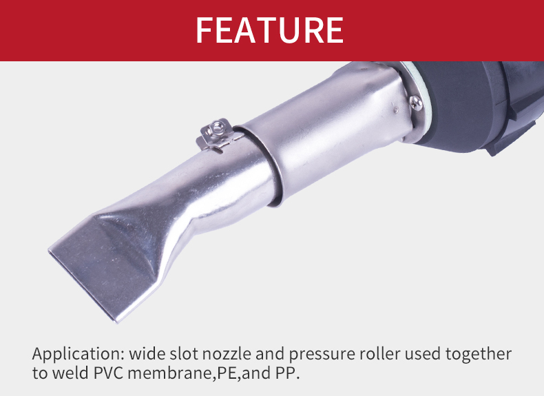 Uygulama: PVC membran, PE ve PP'yi kaynaklamak için geniş yuvalı nozul ve basınç silindiri birlikte kullanılır.