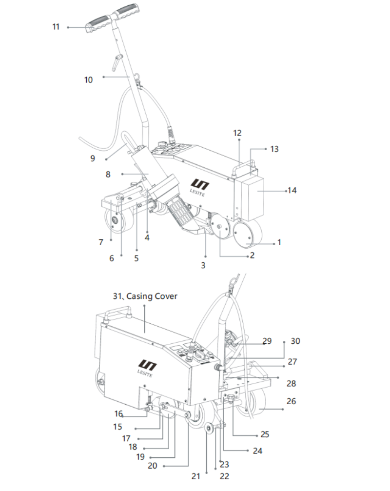 1、Pressure Roller 2、Drive Roller 3、Hot Air Nozzle 4、Hot Airblower Fixed Slider 5、Machine Frame 6、Hot Air Blower Guide Screw 7、Hot Air Blower Fixed Set 8、Hot Air Blower 9、Power Wire Of Hot Air Blower 10、Guide Bar 11、Handle 12、Lift Handle 13、Clump Weight (middle) 14、Clump Weight ( outer) 15、Belt Wheel Fixed Screw 16、Rolling Wheel 17、Round Belt 18、Belt Wheel 19、Belt Wheel Linkage 20、Front Wheel (left) 21、Guide Wheel 22、Fixed Axle Of Guide Wheel 23、Fixed Plate of Guide Wheel 24、Limit Groove Plate Of Guide Wheel 25、Handle Of Guide Wheel 26、Front Wheel (right) 27、Guide Rail Of Hot Air Blower 28、Baffle Of Micro Switch 29、Adjusting Screw 30、Position Handle Of Hot Air Blower