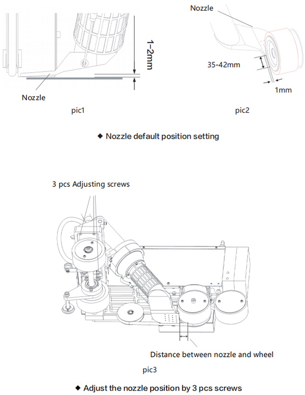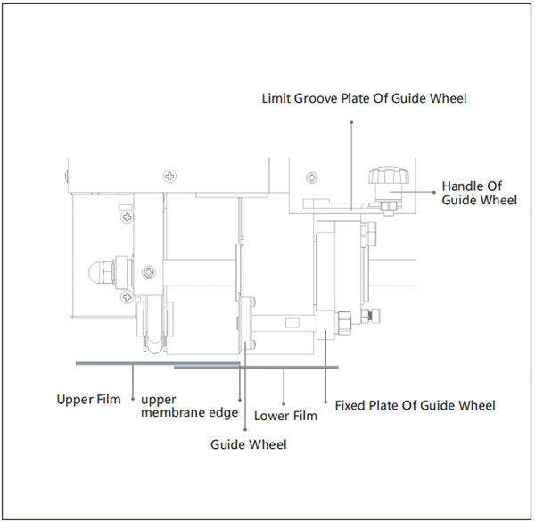 2. Lift guide bar to make front wheel (left) off the ground, slide handle of guide wheel to right side until the right position of limit groove plate of guide wheel, to keep the guide wheel in the same alignment with the edge of upper film.