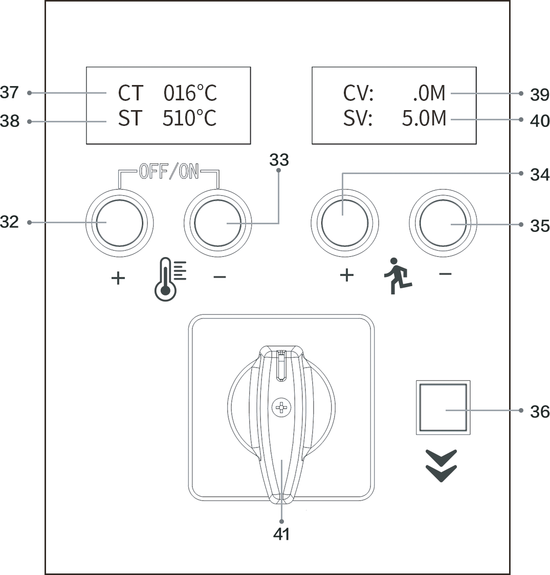 ② Press the buttons Temperature Rise (32) and Temperature Drop (33) at the same time. At this time, the air blower starts to heat up to the setting temperature.