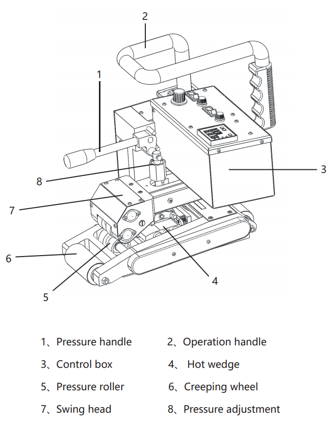 8、After finishing welding, lift up the pressure handle (1), and move the machine away from the welding position.