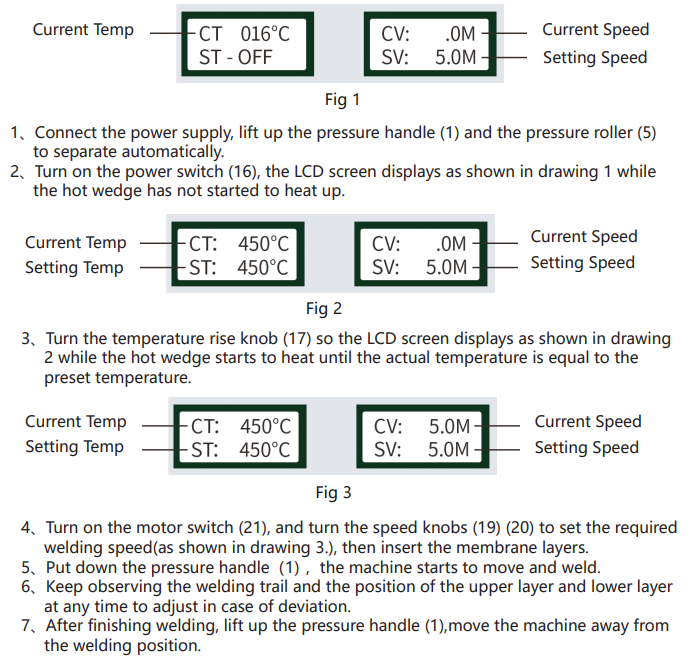 6、Put down the pressure handle(1) ,the machine starts to move and weld.